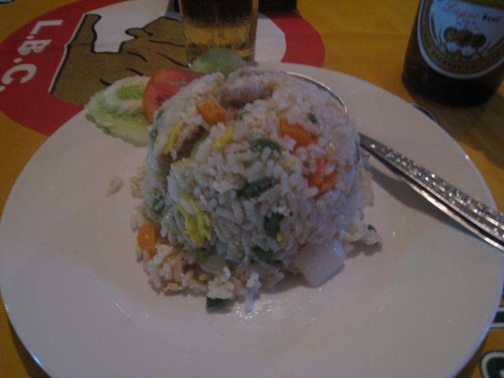 お昼に言った”THE PIZZA”というカフェに再度行き、フライドライスwithチキン、フライドフィッシュwithレモン、ビアラオ1本を頼んだ。