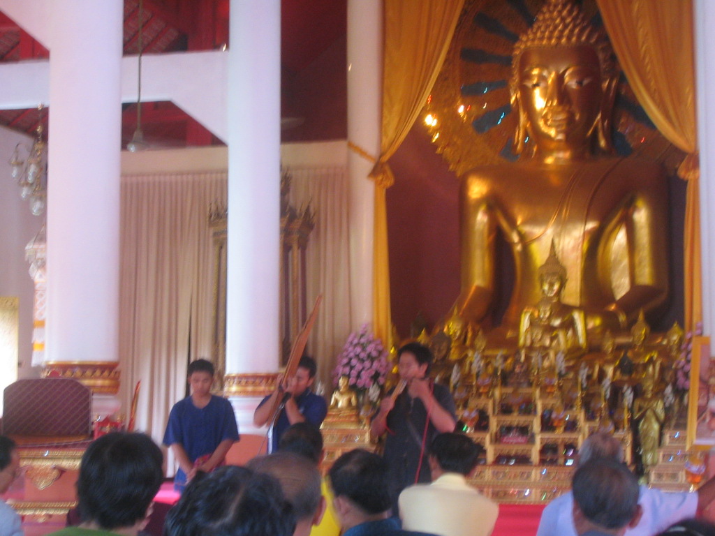 近づくと、堂の中に人が集まり、竹のようなもので作られた楽器で仏像の前で1〜3人で演奏していた。