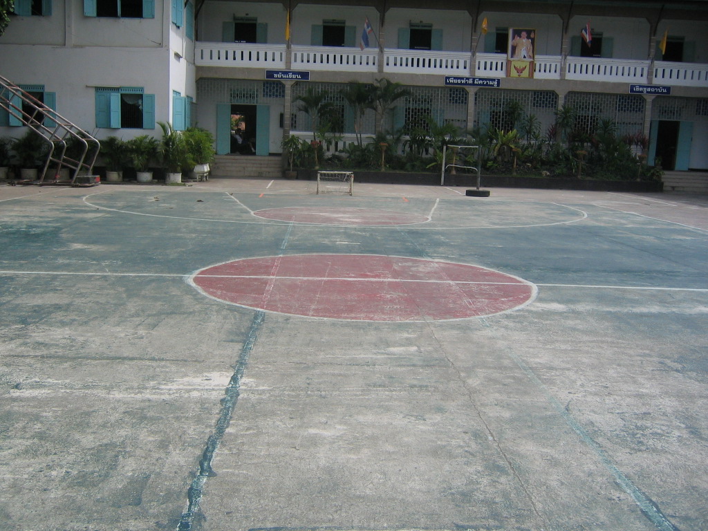 堂の外に学校とバスケコートがあった。