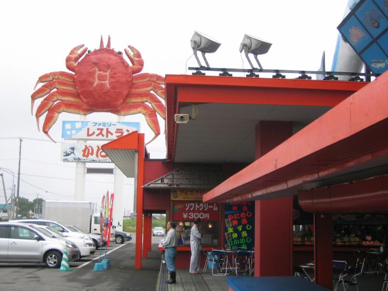 大きなカニのはりぼて?があったので、そこで昼食を取るも、雨で体温が奪われて思うように手が動かない。