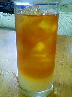 ジュースが入ったコップに、氷をつたってゆっくりと先ほど冷やした紅茶を注ぎます。これで完成。